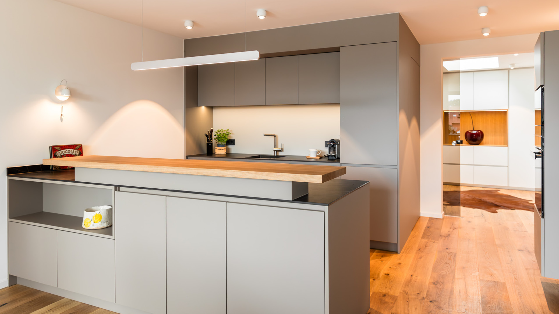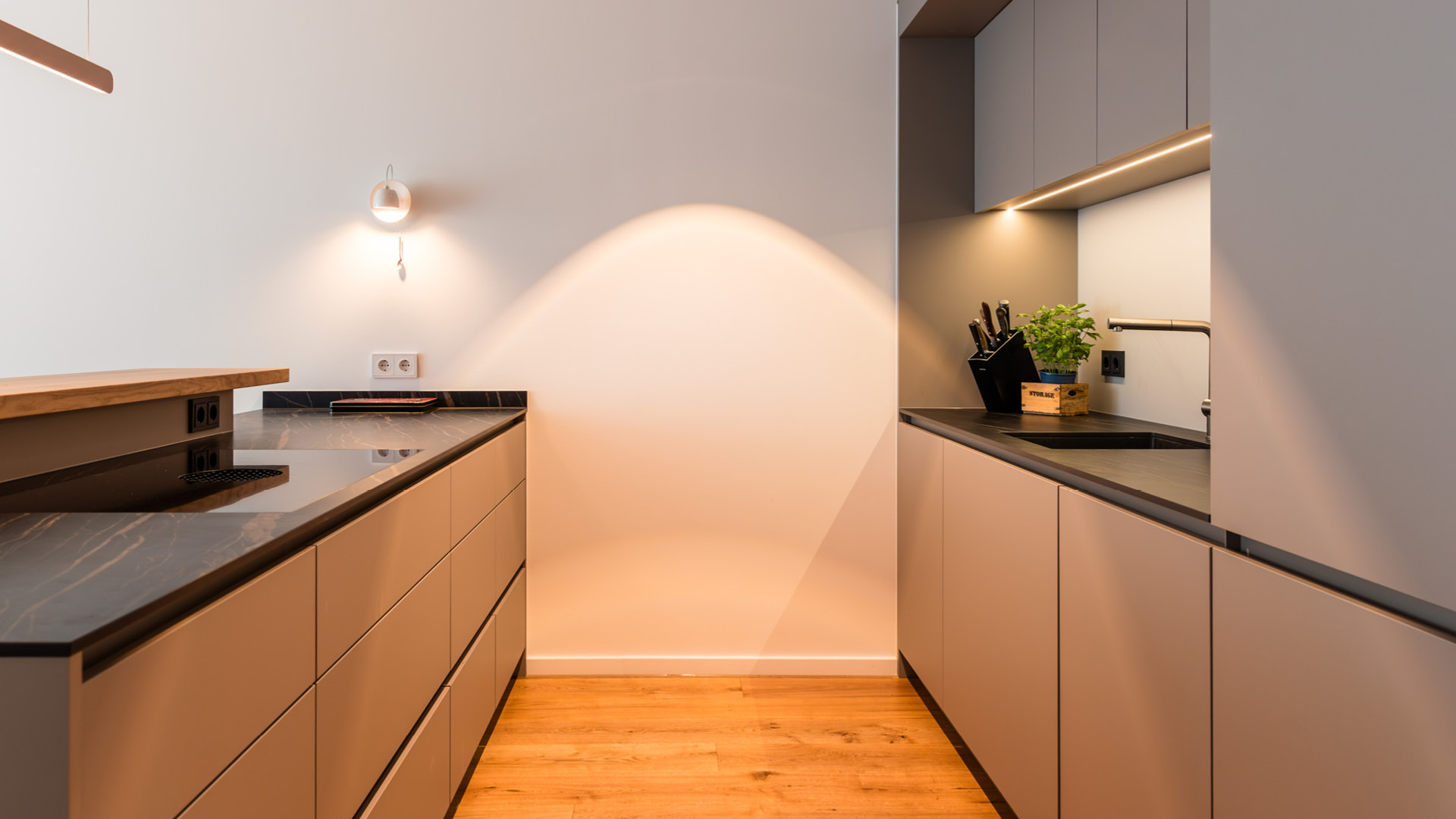 Die besondere Herausforderung: schmale, tiefe Raumzuschnitte, die wenig Tageslicht in die Küche ließen. Für unsere backbegeisterte Kundin entwickelten wir eine clevere Lösung, die Funktionalität und Ästhetik perfekt vereint.