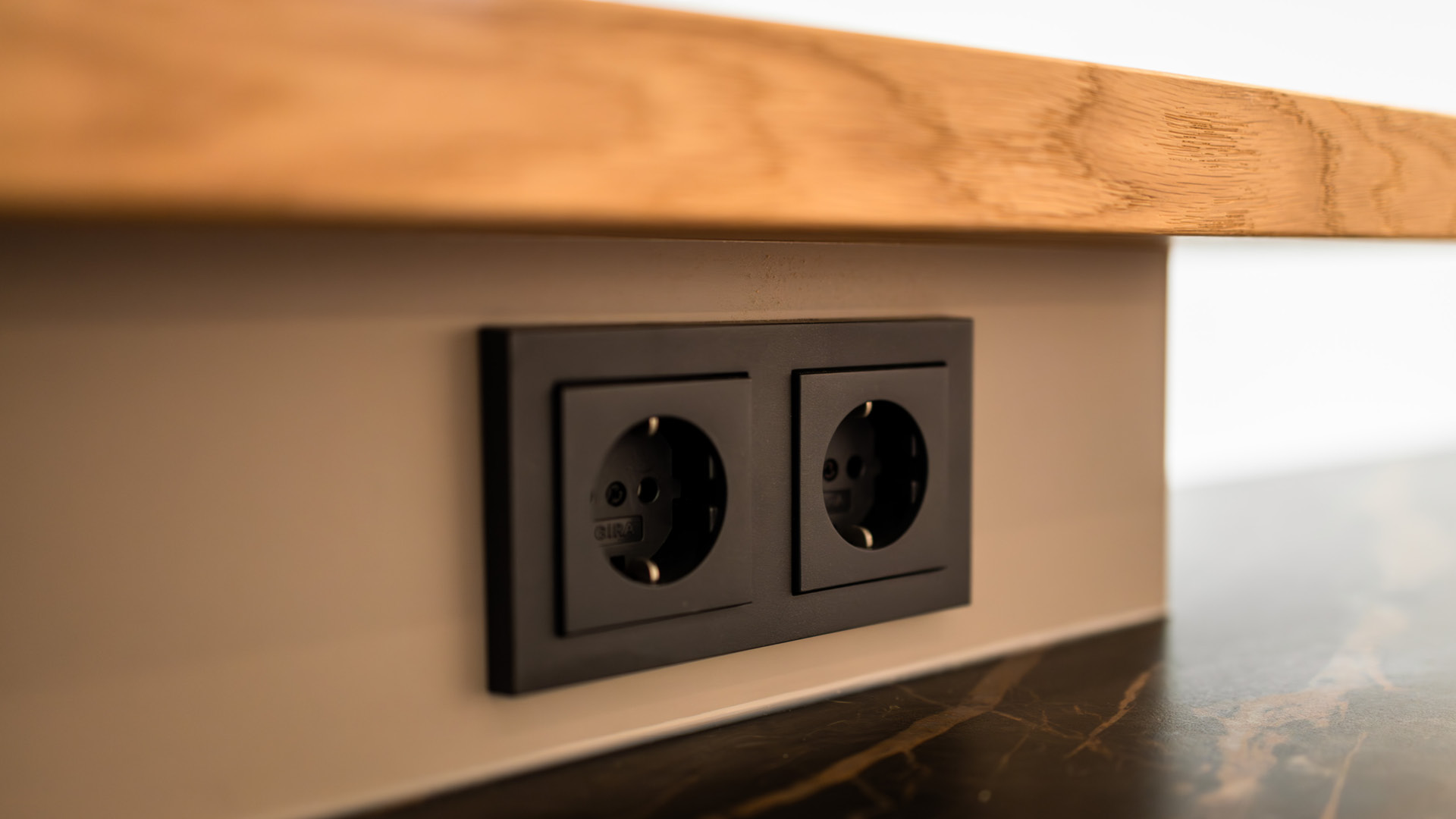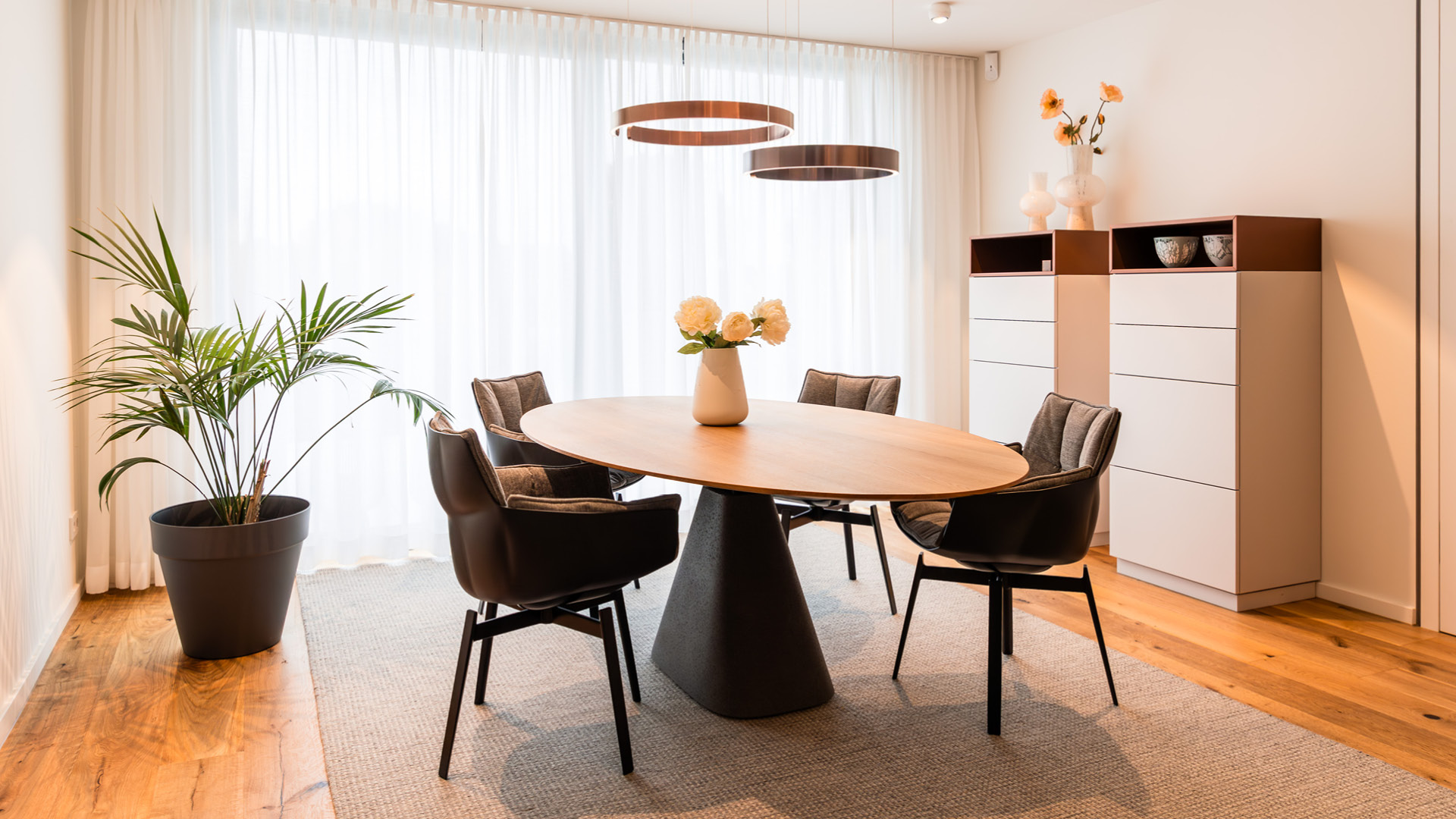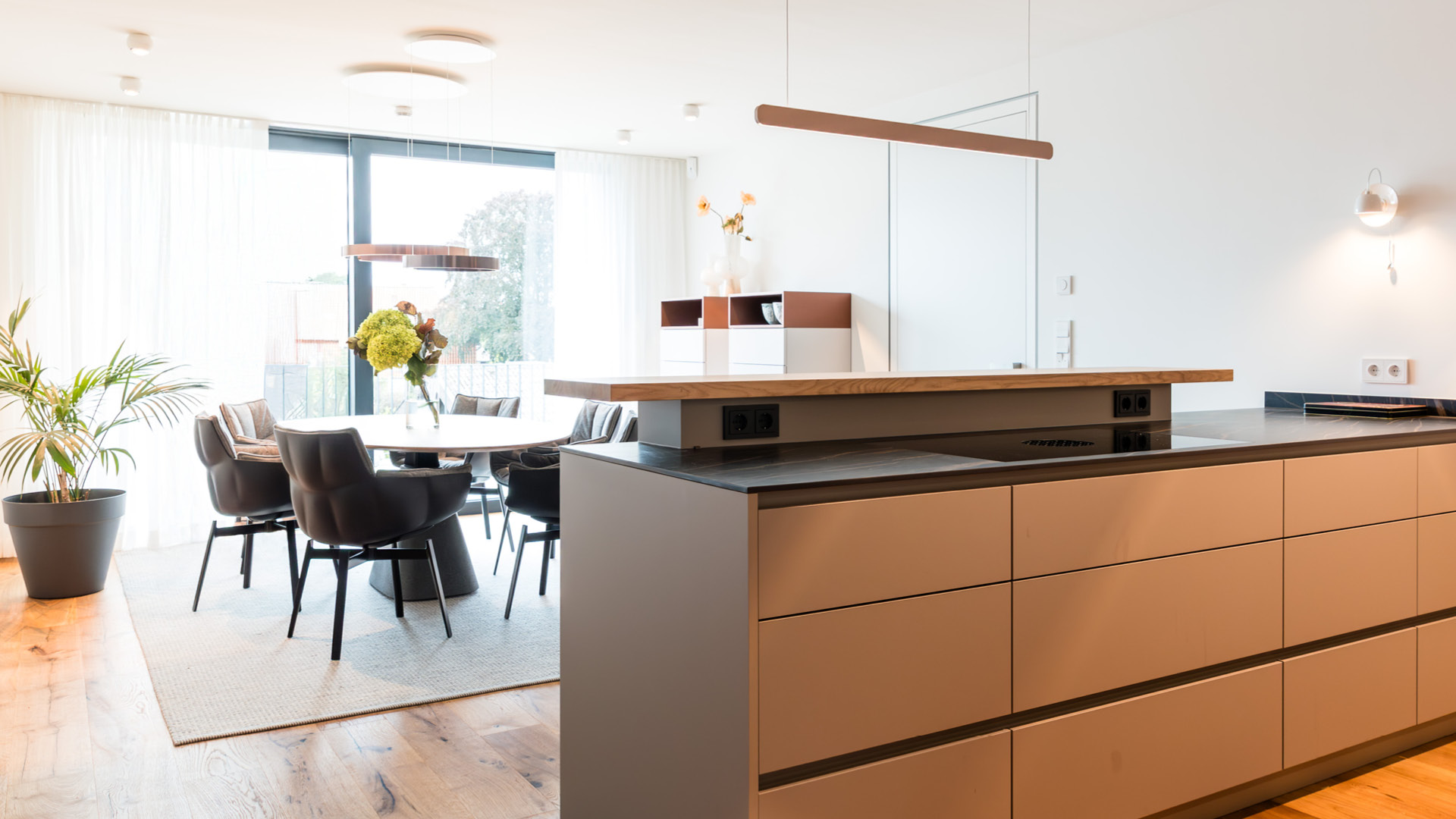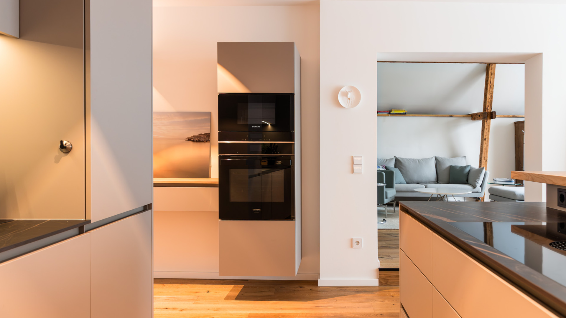 Mit gestalterischem Gespür wurde der Backofen optisch an der Wand „schwebend“ platziert und durch ein Holzboard ergänzt, das elegant die Formensprache der Kücheninsel aufgreift und fortführt. Diese durchdachte Detaillierung schafft eine visuelle Kontinuität und Kohärenz im Gesamtraum.