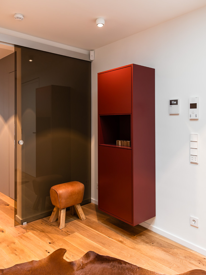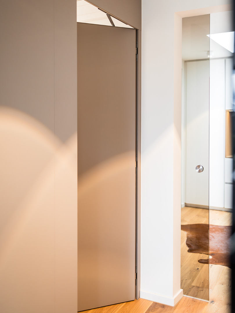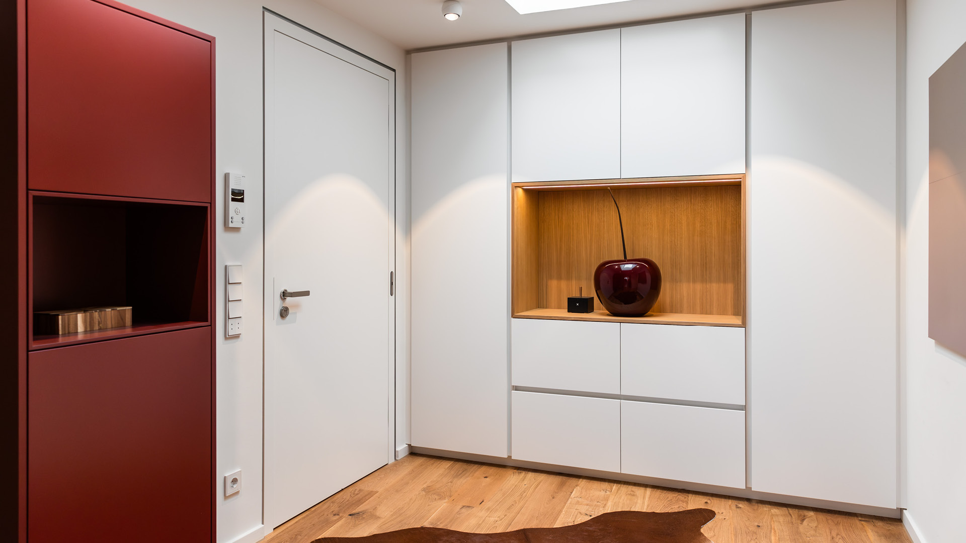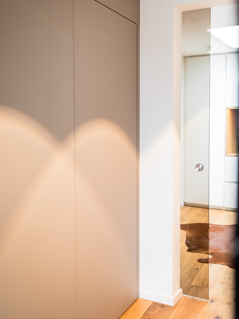 Die nahezu unsichtbare Tür, die optisch mit dem Schrank verschmilzt, ermöglicht einen flexiblen Wechsel zwischen Präsenz und Purismus.