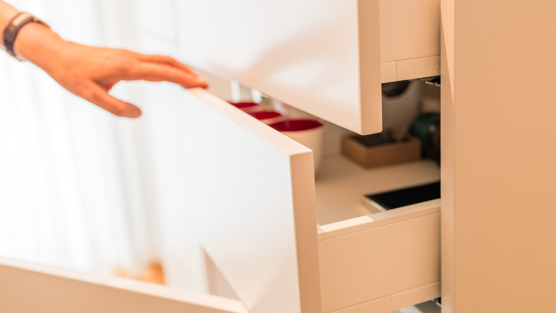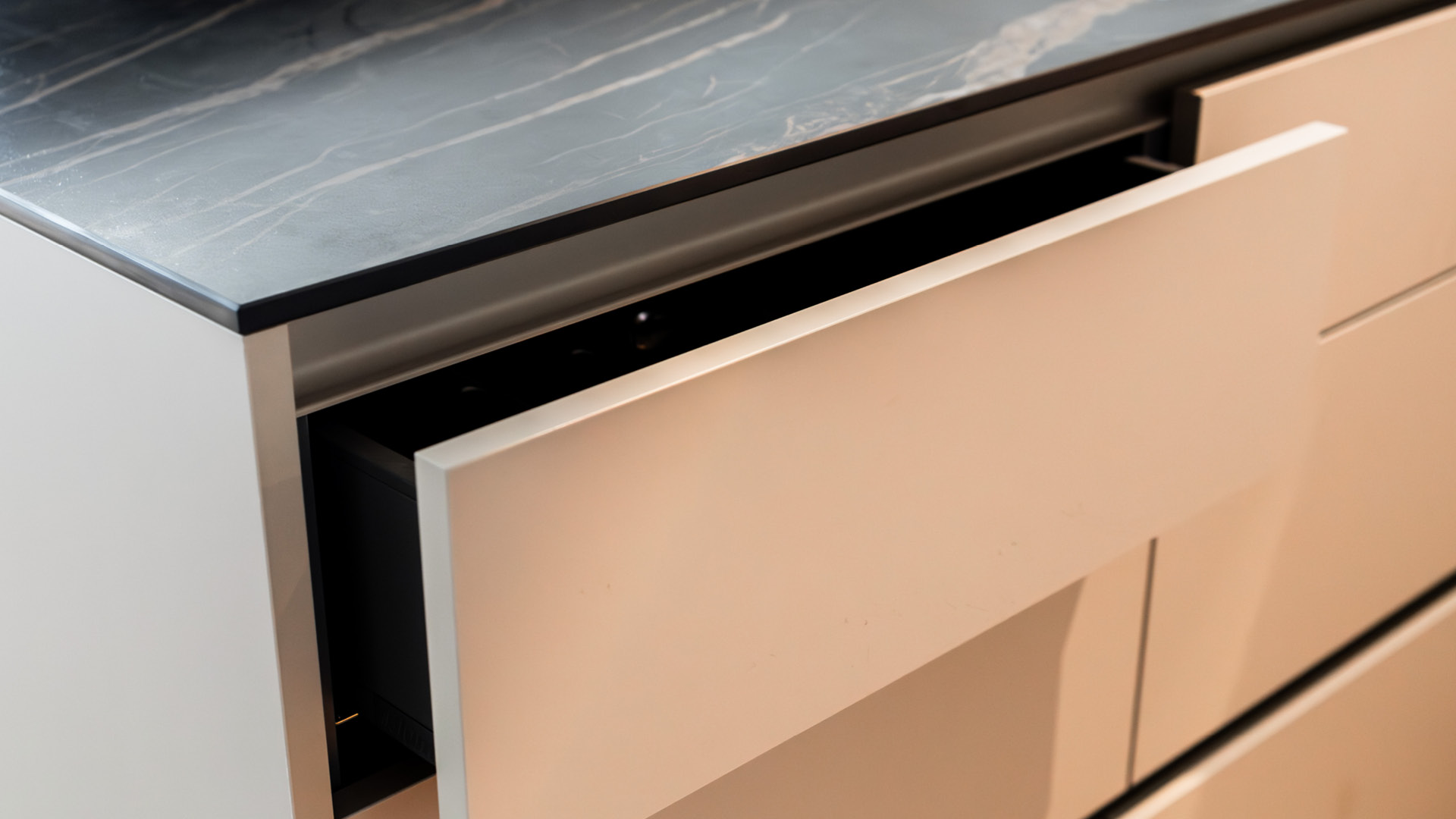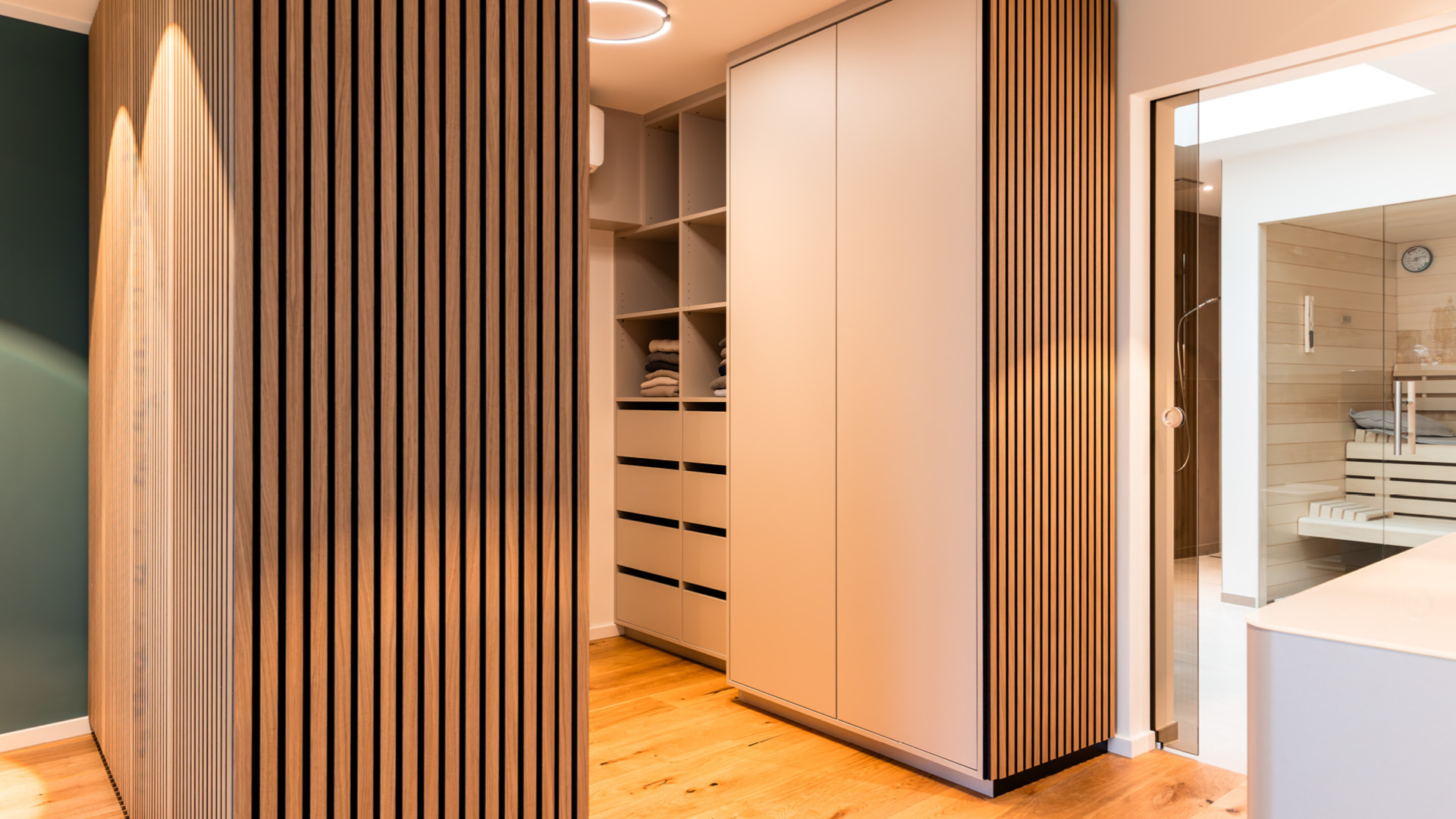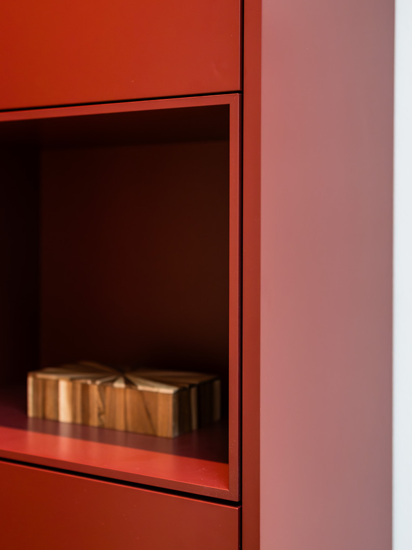 Die nahezu unsichtbare Tür, die optisch mit dem Schrank verschmilzt, ermöglicht einen flexiblen Wechsel zwischen Präsenz und Purismus.